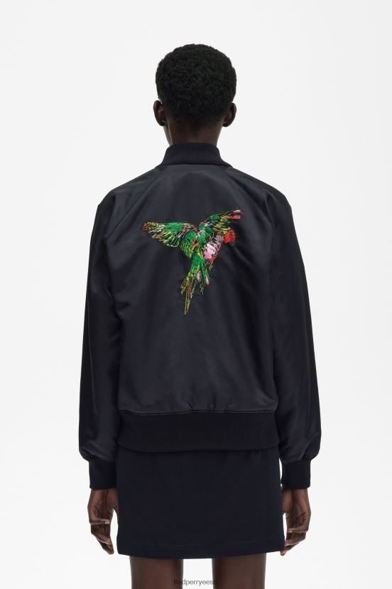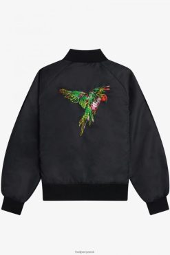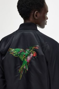 Osaliselt taaskasutatud nailonist / lõdvestunud istuvusega / polsterdatud keha ja varrukad / troopiliste lindude tikandid seljale. / ribi kaelus, kätised ja alläär